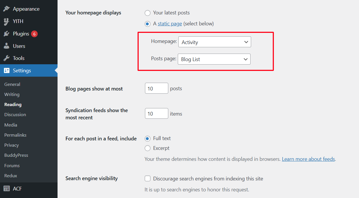 To configure BuddyPress settings, go to WP Dashboard > Settings > BuddyPress .