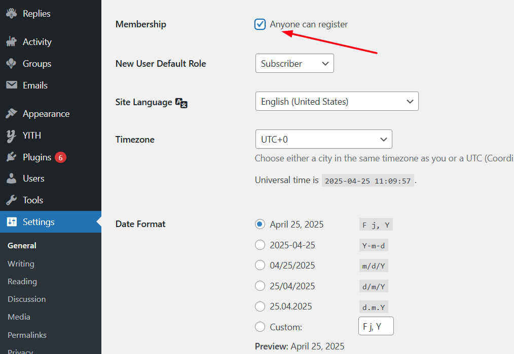 To enable user registration on your site, go to Settings > General in your WordPress dashboard and check the option Anyone can register. This will allow users to create accounts on your site through the registration page.