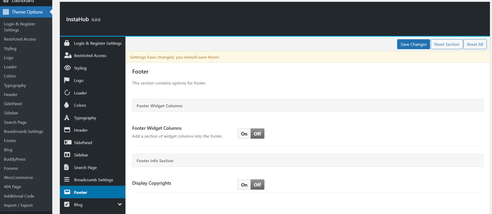 In the Theme Options > Footer , you can customize the footer of your site, including the copyright text, footer layout, and any additional content or widgets you'd like to display. This gives you control over the footer’s appearance and functionality.