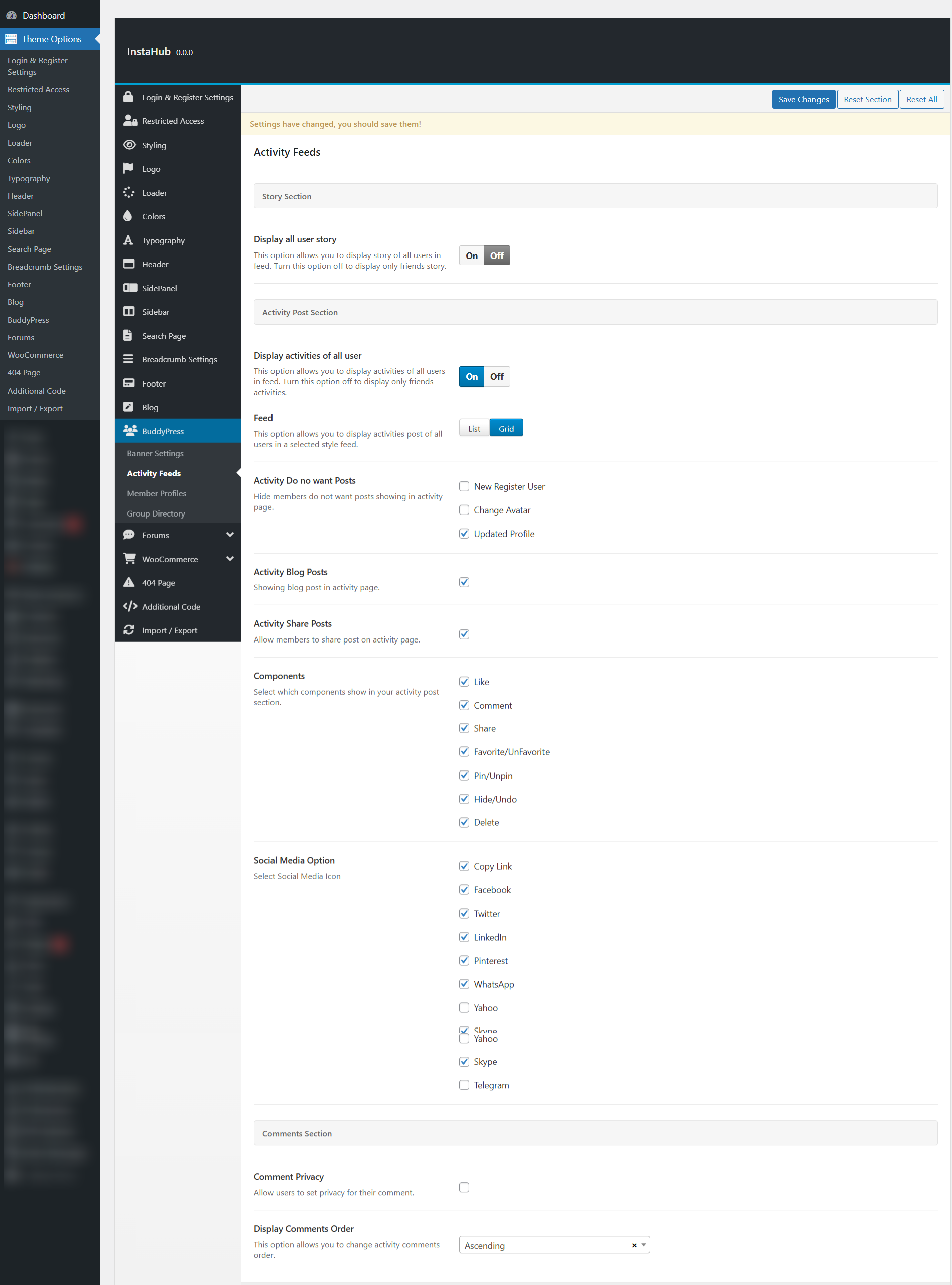 In the Theme Options > BuddyPress > Activity Feeds , you can configure the display of activity posts and actions. This option allows you to show or hide various actions such as "Favorite," "Undo," "Delete," "Pin," and other activity actions, giving you control over the visibility of these options in the activity feed.