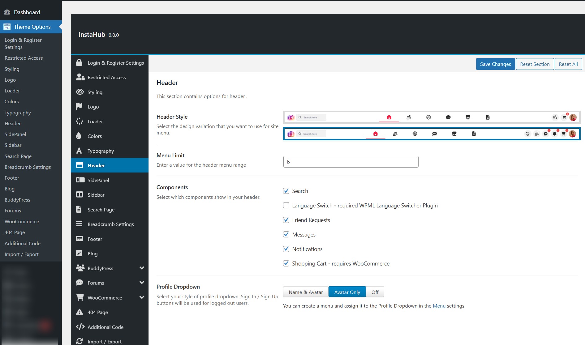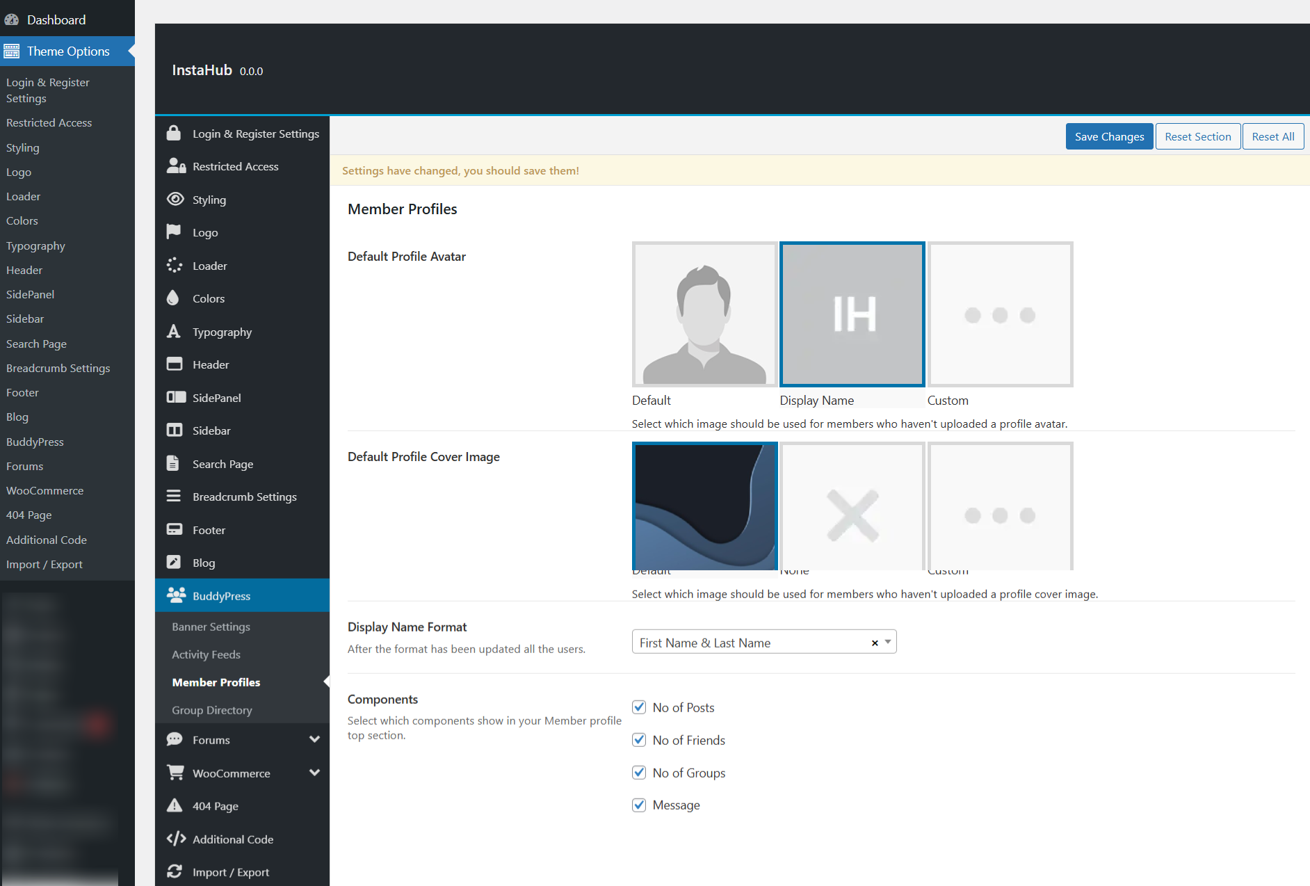 In the Theme Options > BuddyPress > Member Profiles , you can customize the appearance of member avatars and profile pages. This option allows you to choose how the avatar is displayed (e.g., name-based, default, or custom), along with additional settings for the profile page layout, such as profile visibility, sections to display, and other profile-related options.