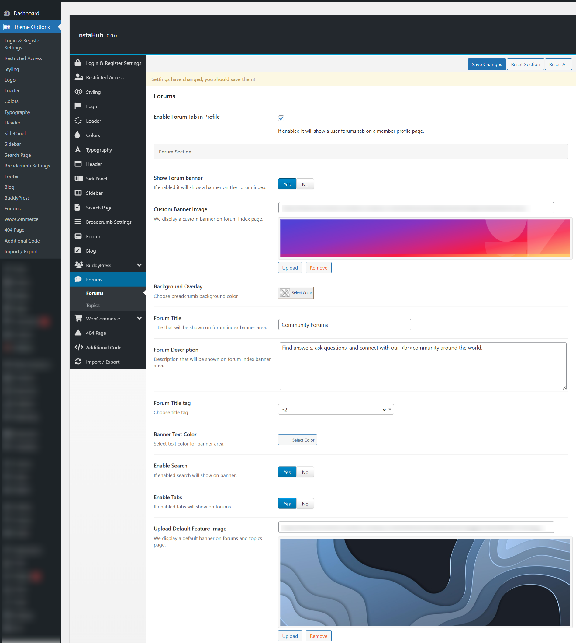 In the Theme Options > Forums , you can customize the forum page settings, including the option to set a custom banner for the forum page. Additionally, you can configure other options such as search settings, forum layout, and the display of forum topics and replies, giving you full control over the forum's appearance and functionality.