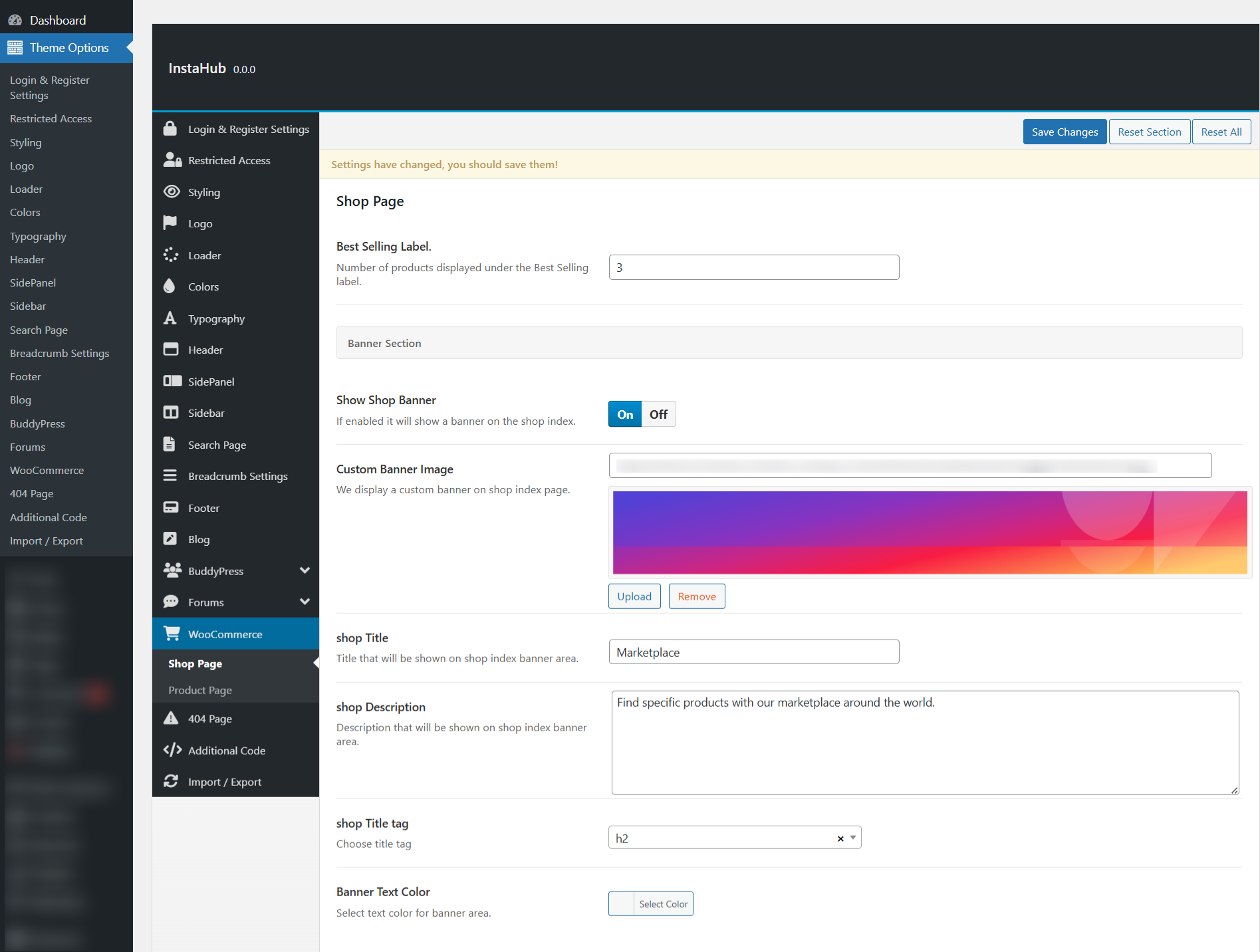 In the Theme Options > WooCommerce > Shop Page , you can customize the shop page settings, including the option to set a custom banner for the shop. This allows you to control the appearance of the shop page, including banner style and other visual elements to match your site’s design.