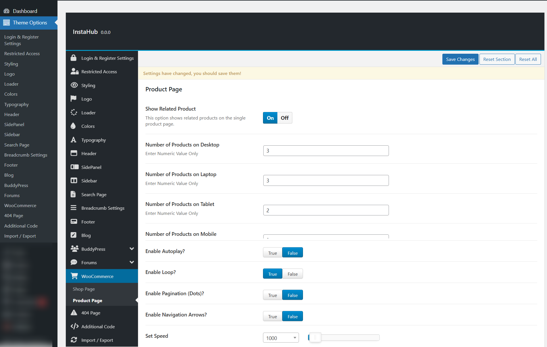 In the Theme Options > WooCommerce > Product Page , you can customize the product page settings, including options for displaying related products.This section allows you to configure how products appear on the single product page, including enabling or disabling related products, setting the number of products shown, and adjusting other display options to enhance the shopping experience.
