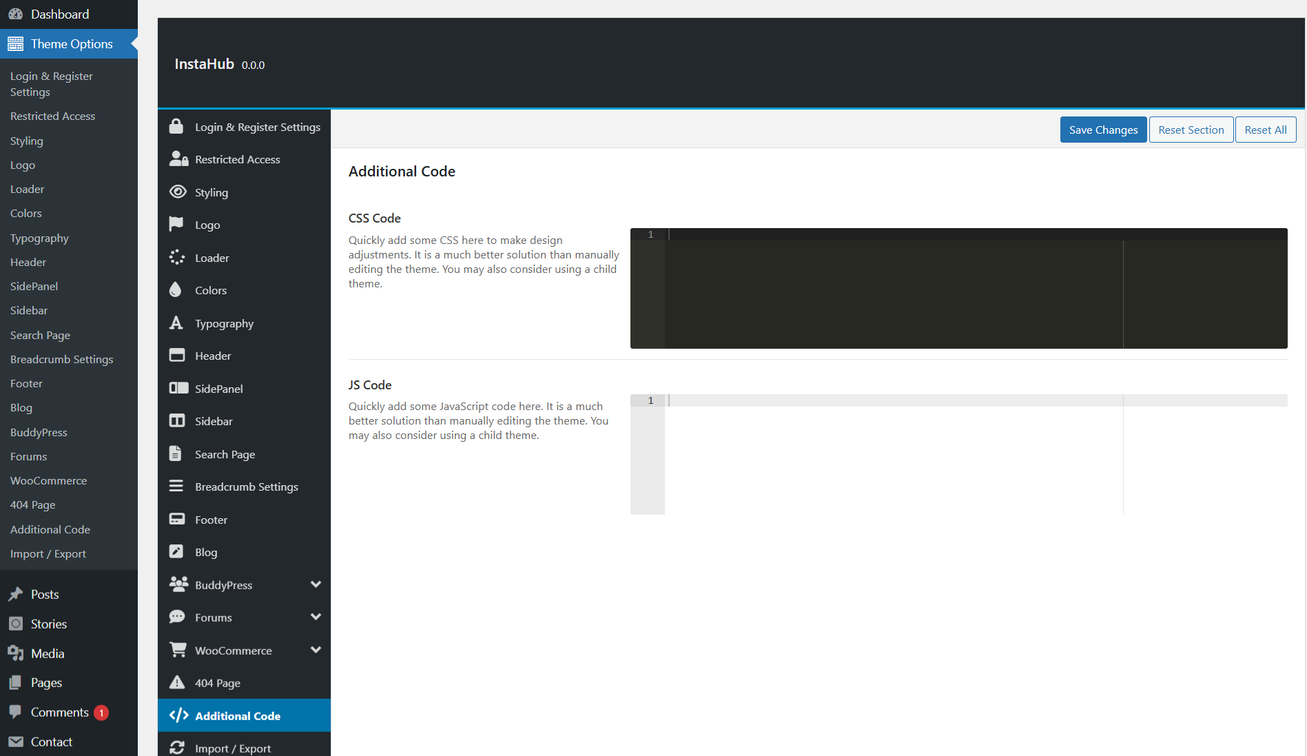 In the Theme Options > Additional CSS & JS , you can add custom CSS and JavaScript to further customize the appearance and functionality of your site. This section allows you to easily insert your own styles and scripts without modifying theme files directly, giving you the flexibility to make adjustments as needed.